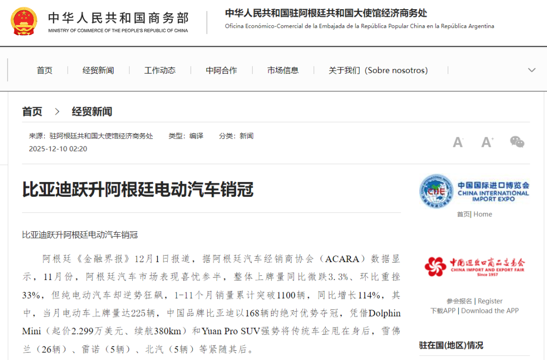 根据中国商务部网站援引阿根廷汽车经销商协会(ACARA)的数据:2025年11月,中国品牌比亚迪以168辆的绝对优势夺冠,强势将传统车企甩在身后,雪佛兰(26辆)、雷诺(5辆)、北汽(5辆)等紧随其后。