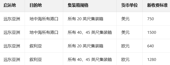调整远东亚洲至地中海航线的旺季附加费(PSS),自2026年1月5日起生效,有效期至另行通知。