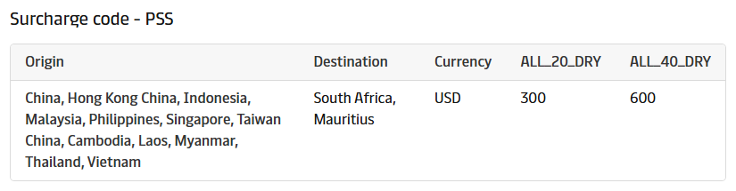 对从远东至西非中南部区域(尼日利亚、科特迪瓦、贝宁、加纳、多哥、赤道几内亚、安哥拉、刚果、刚果民主共和国、纳米比亚、加蓬、喀麦隆)的干货及冷藏货收取每标准箱300美元的旺季附加费(PSS)。