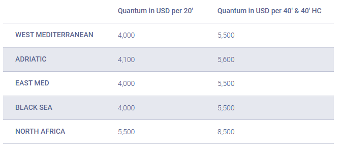 适用于亚洲所有主要港口至地中海及北非所有港口(含西地中海、亚得里亚海、东地中海、黑海、北非)的干货、冷藏货、超大件货物、付费空箱。