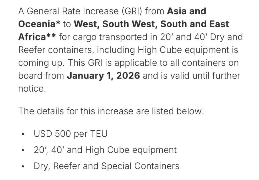 对亚洲及大洋洲至非洲西部、西南部、南部及东部航线的20英尺和40英尺干货箱、冷藏箱(含高箱)、特种箱征收普涨运费(GRI),每标准型收取500美元,有效期自2026年1月1日起至另行通知。