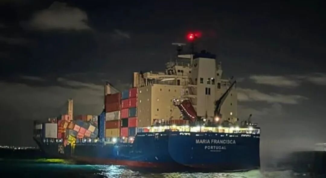 据悉,涉事船舶“玛丽亚·弗朗西斯卡”轮(Maria Francisca)日前抵达维戈港(Port of Vigo),船上两排集装箱货柜出现明显倾倒,多只箱体受损并悬挂在船舷外侧,同时有数量不明的货柜坠海,事故现场画面引发关注。