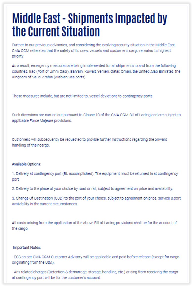 从公告内容看,达飞对伊拉克乌姆盖斯尔港、巴林、科威特、也门、卡塔尔、阿曼、阿联酋及沙特阿拉伯等中东主要港口相关货物,已启动包括船舶改道、紧急港口卸货及其他运营调整在内的应急措施,并明确表示这些安排将依据不可抗力条款执行。