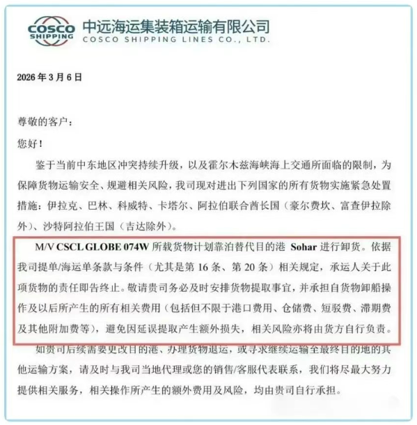 2026年3月6日,中远海运发布通知,对伊拉克、卡塔尔等6个国家及港口(部分港口除外)的货物实施紧急处置,其中,M/V CSCL GLOBE 074W所载货物将改在阿曼的苏哈尔港(Sohar)卸货。