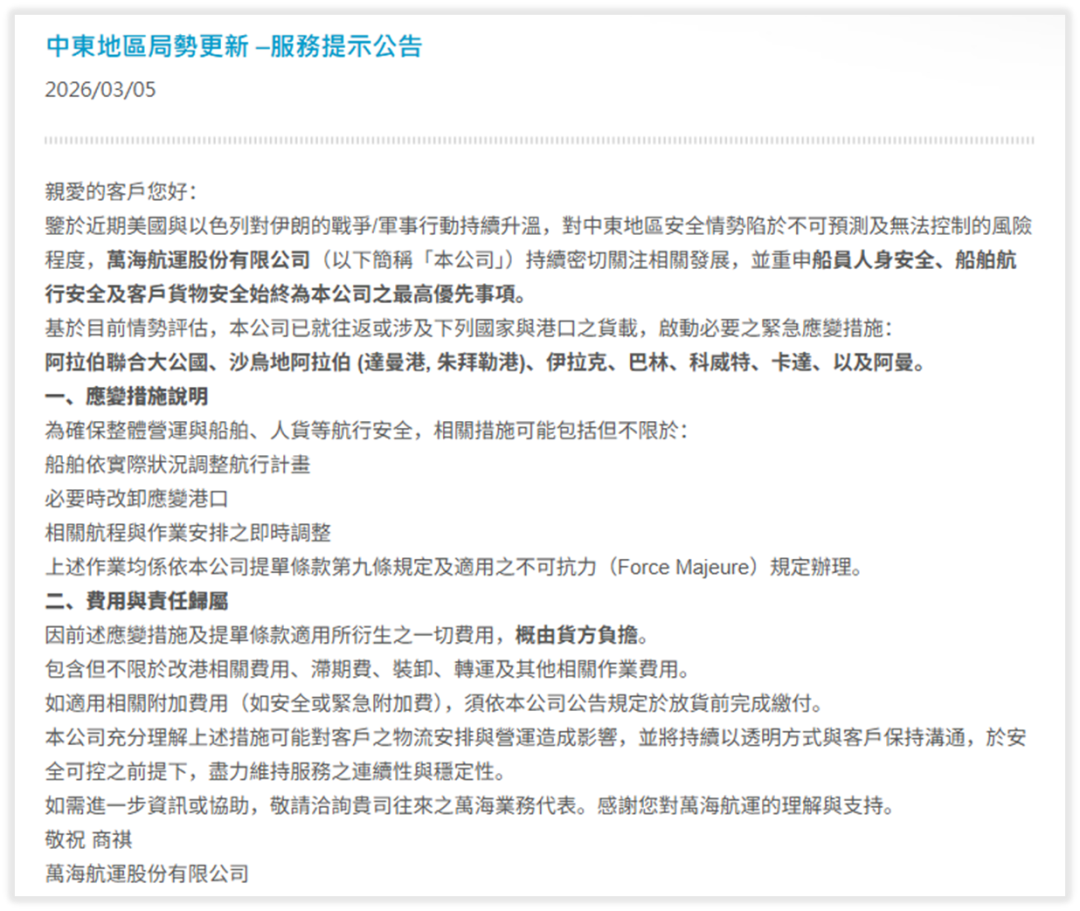 万海航运则在3月5日发布通知称,针对阿联酋、沙特阿拉伯(达曼港、朱拜勒港)、伊拉克、巴林、科威特、卡塔尔和阿曼等国家和港口相关货载,公司已启动必要的紧急应变措施。