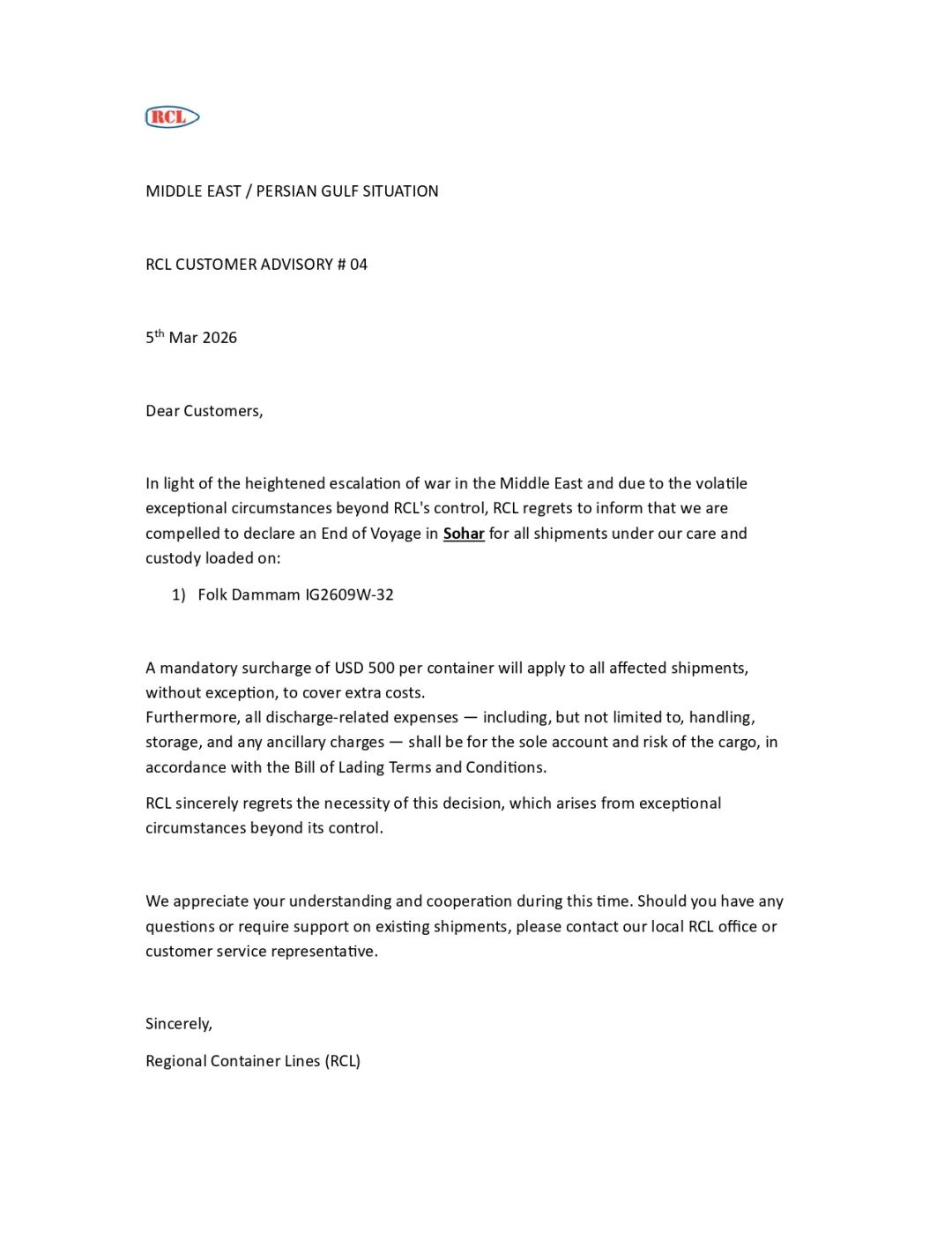 宏海箱运(RCL):航次提前终止,征收强制附加费