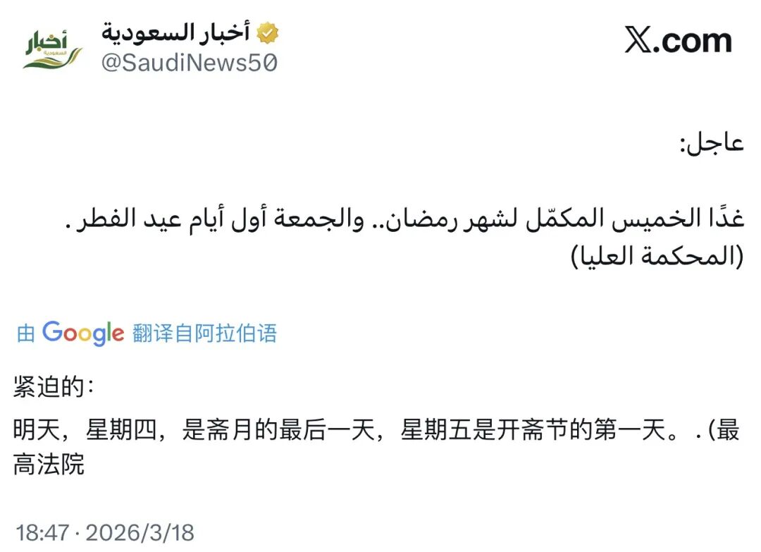 沙特最高法院已正式对外宣布,基于目前观测结果,3月20日(星期五)被视为开斋节第一天。