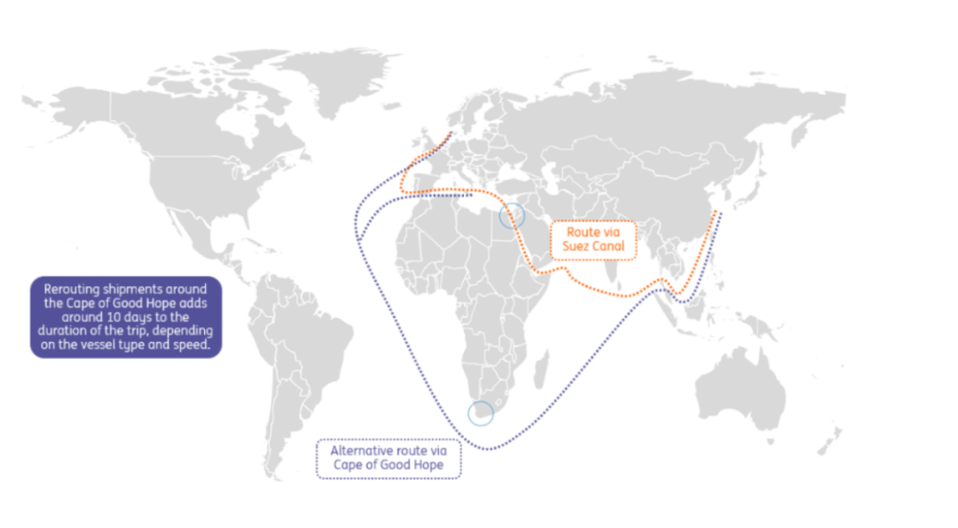霍尔木兹海峡3月通行量暴跌94%(77 艘 vs 去年同期1229艘),曼德海峡面临封锁风险,马士基、赫伯罗特等巨头集体弃走红海/苏伊士航线,南非Transnet国家港务局数据显示,好望角绕行船舶激增112%,红海航线2026年重返彻底暂停,好望角正式成为全球航运 “新咽喉”;绕行直接导致运输时间延长10-30天,航程增加3500-4000海里。