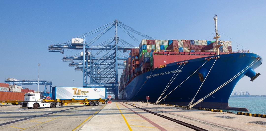 2019年,相继靠泊1.4万TEU和2.1万TEU超大型船舶;2022年,全年集装箱吞吐量超过100万TEU;2023年,靠泊当时哈里发港2.4万TEU的最大型船舶,全年集装箱吞吐量超135万TEU;2024年,全年集装箱吞吐量突破184万TEU,连续三年增长率超过35%。