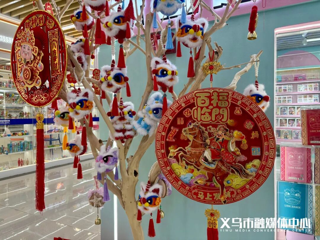 12月14日,小布来到位于义乌全球数贸中心的纸想造物商铺,目光便不由得被门口的“醒狮树”所吸引。十余只精致小巧的醒狮挂件错落有致地悬挂在枝干上,搭配电动对联挂件,成为整条街上的喜庆一角。
