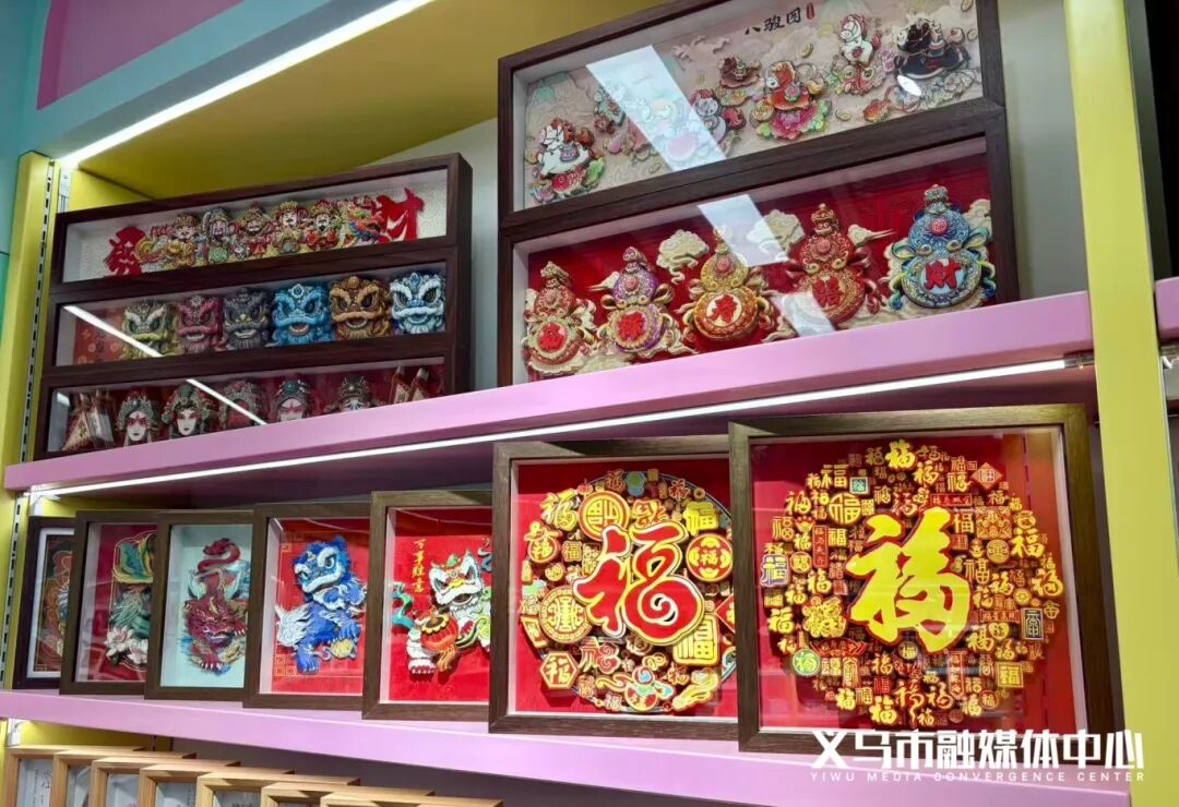 进纸想造物商铺内,财神相框画、Q版八骏图相框画等整齐陈列于展示柜上,“柿柿如意”扭扭棒盆栽、招财冰箱贴摆件也格外吸睛。
