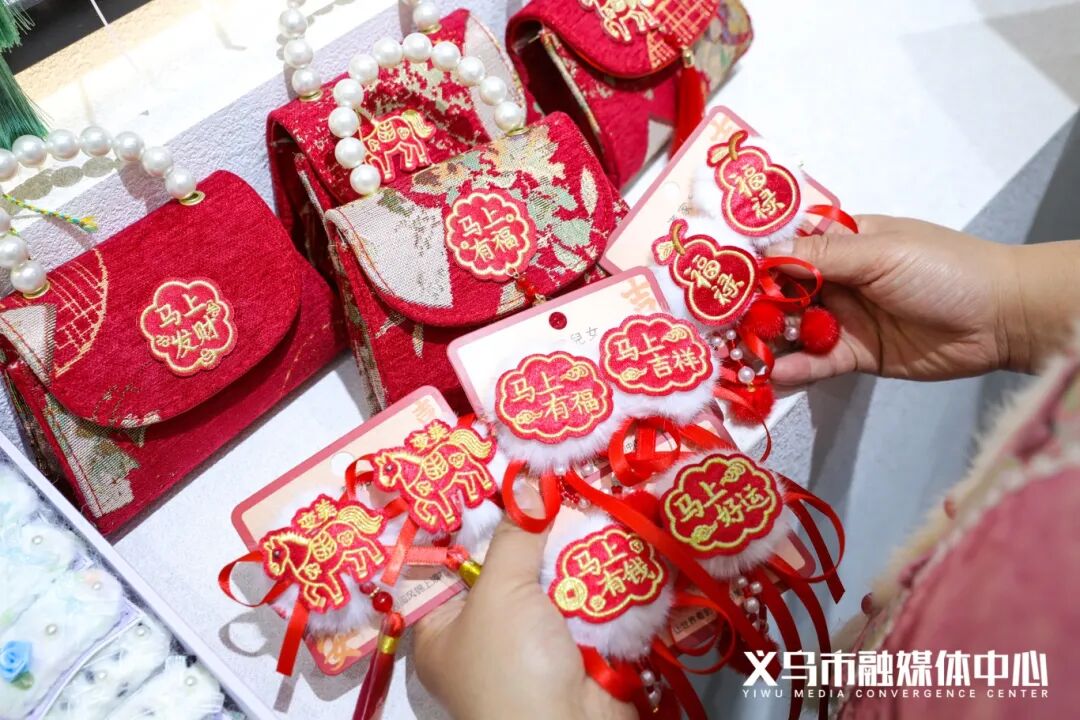 除了喜庆用品区块里扑面而来的红火气息,潮玩、饰品等区块也纷纷推出新年产品,用一抹亮色装点“世界超市”。“马”元素、“福”字、财神形象等传统文化元素经由创意设计焕发出全新活力,更新、更潮、更可玩的新年好物吸引着国内外采购商的目光。